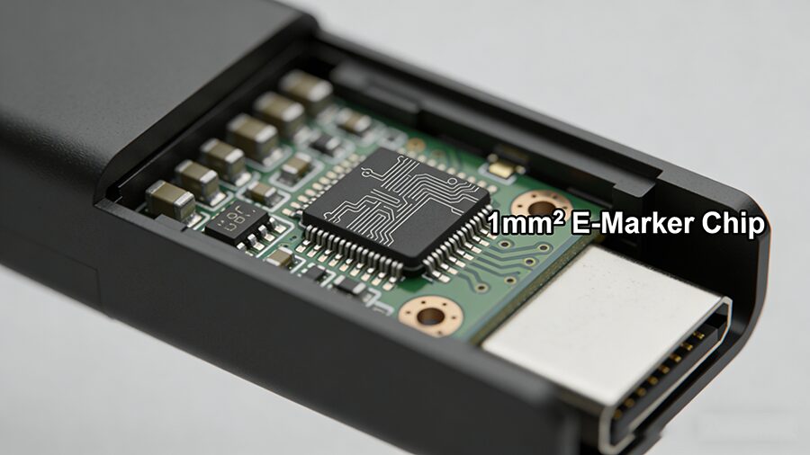 Think of it as a digital ID tag for your USB-C cable. When you plug two devices together, the E-Marker tells your charger, laptop, or phone exactly how much power the cable can carry, how fast it can transfer data, and whether it supports video output – no guesswork required.