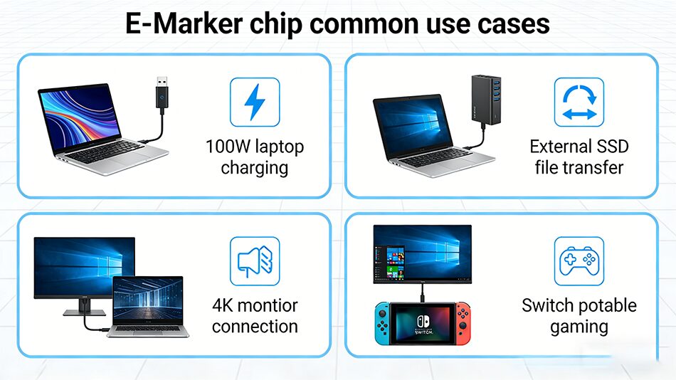 Any time you connect a device to a monitor, TV, or portable display via USB-C Alt Mode, you need an E-Marker to carry the video signal. Non-E-Marker cables can’t support video output, which is the #1 cause of “no signal” errors for USB-C displays. - High-performance accessories